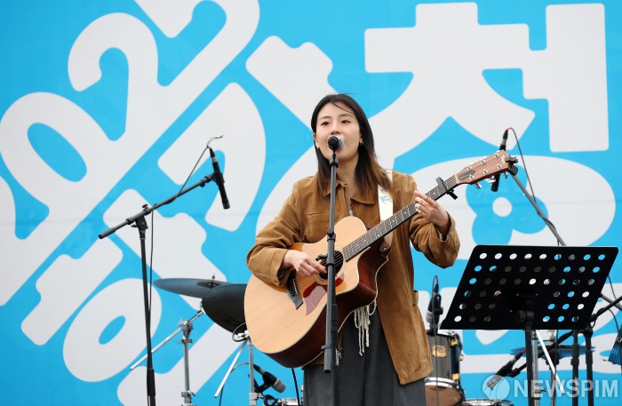 [서울=뉴스핌] 정일구 기자 = '히든스테이지 시즌3' 임예송이 18일 오후 서울 서초구 반포한강공원 세빛섬 야외무대에서 감엔터테인먼트 주최로 열린 '2025 한강 청년 버스킹 축제'에서 라이브 공연을 선보이고 있다. 2025.10.18 mironj19@newspim.com