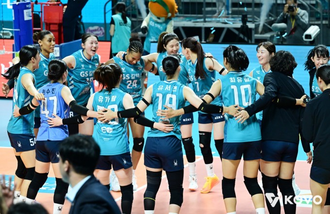 GS칼텍스 선수들이 19일 V리그 여자부 기업은행과의 홈경기에서 승리한뒤 기쁨을 나누고 있다. [사진=KOVO] |