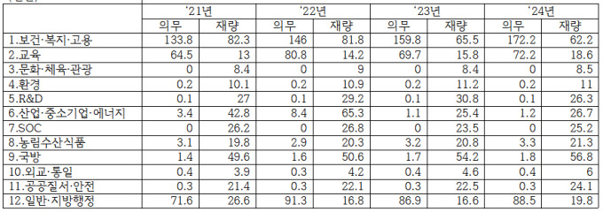 반면 같은 기간 보건·복지·고용 분야 의무지출은 26조2000억원 늘었다. 무분별한 감세 등으로 부족해진 재정을 줄일 수 없는 의무지출 대신 재량지출을 대폭 줄이는 방법으로 대응한 셈이다.