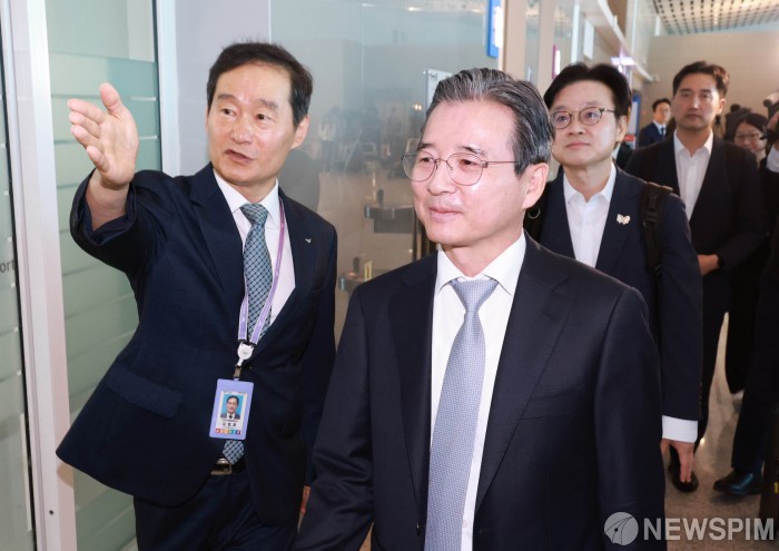 [영종도=뉴스핌] 김학선 기자 = 김용범 대통령실 정책실장과 김정관 산업통상자원부 장관이 지난 16일 한미 관세 협상 후속 협의를 위해 인천국제공항을 통해 미국으로 출국하고 있다. 2025.10.16 yooksa@newspim.com |