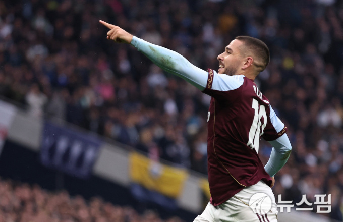 [런던 로이터=뉴스핌] 애스턴 빌라의 부엔디아가 20일 열린 토트넘과의 EPL 8라운드 경기에서 역전골을 넣은 뒤 세리머니 하고 있다. 2025.10.20 wcn05002@newspim.com |