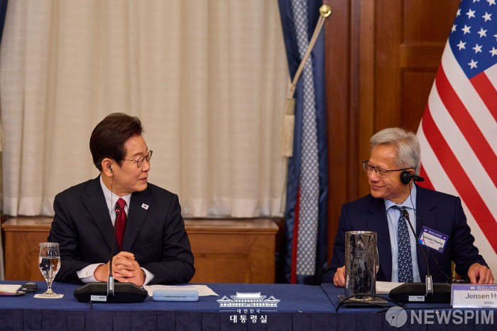 [서울=뉴스핌] 이재명 대통령이 지난 25일(현지시간) 미국 워싱턴DC 윌라드 호텔에서 열린 한미 비즈니스 라운드 테이블에서 젠슨 황 엔비디아 최고경영자와 대화를 나누고 있다. [사진=대통령실] 2025.08.27 photo@newspim.com |