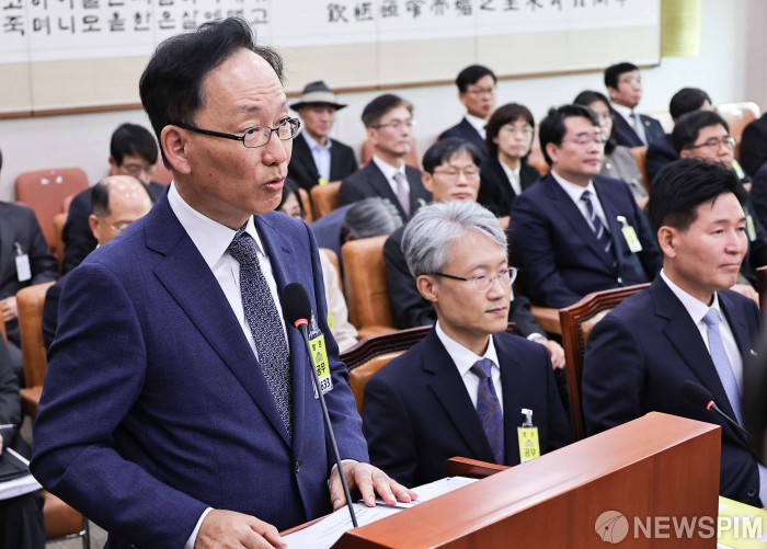 [서울=뉴스핌] 윤창빈 기자 = 김대웅 서울고등법원장이 20일 오전 서울 여의도 국회에서 법제사법위원회의 서울고등법원 등에 대한 국정감사에서 업무보고를 하고 있다. 2025.10.20 pangbin@newspim.com