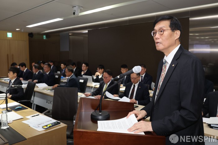 [서울=뉴스핌] 김학선 기자 = 이창용 한국은행 총재가 20일 오전 서울 중구 한국은행에서 열린 국회 기획재정위원회의 한국은행에 대한 국정감사에서 업무보고를 하고 있다. 2025.10.20 yooksa@newspim.com
