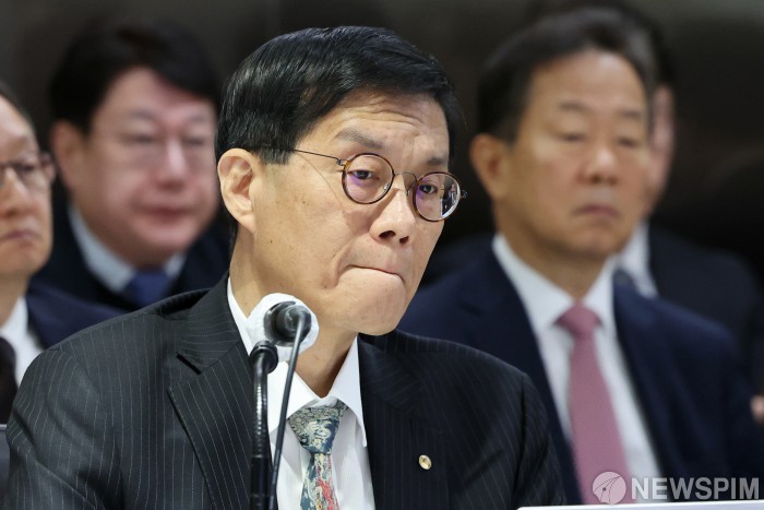 [서울=뉴스핌] 김학선 기자 = 이창용 한국은행 총재가 20일 오전 서울 중구 한국은행 본점에서 열린 2025년도 국회 기획재정위원회 한국은행 국정감사에서 생각에 잠겨 있다. 2025.10.20 yooksa@newspim.com