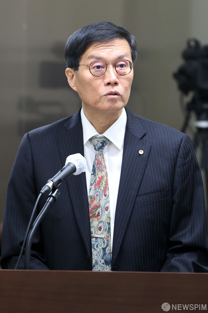 [서울=뉴스핌] 김학선 기자 = 이창용 한국은행 총재가 20일 오전 서울 중구 한국은행에서 열린 국회 기획재정위원회의 한국은행에 대한 국정감사에서 업무보고를 하고 있다. 2025.10.20 yooksa@newspim.com