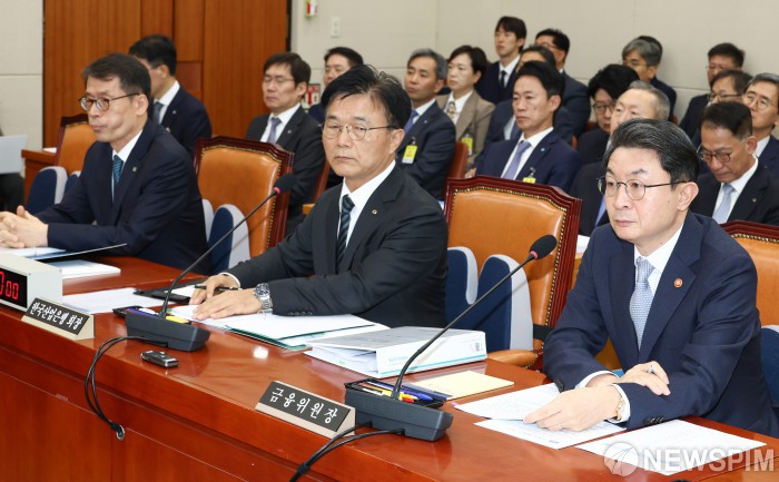 [서울=뉴스핌] 최지환 기자 = 김성태 중소기업은행장(왼쪽부터), 박상진 한국산업은행 회장, 이억원 금융위원장이 20일 오전 서울 여의도 국회 정무위원회에서 열린 금융위원회 등에 대한 국정감사에 자리해 있다. 2025.10.20 choipix16@newspim.com