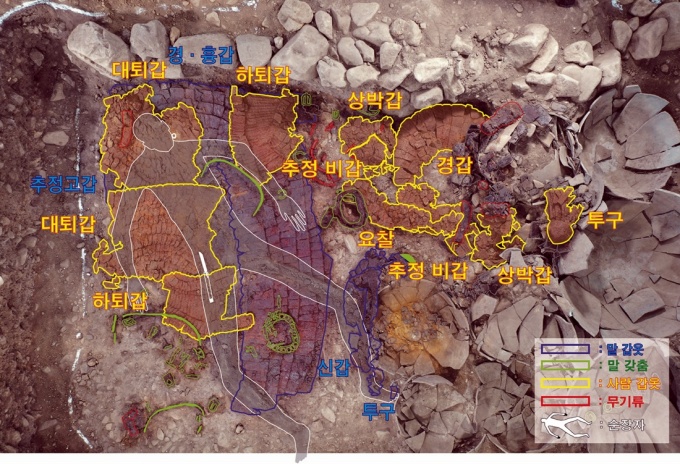 무덤에서는 사람과 말의 갑옷·투구 일체, 금동관 일부, 남성 장수의 인골, 순장된 시종의 인골이 함께 나왔다.