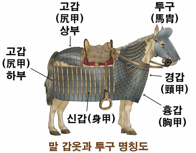 말 갑옷 명칭도. 신라 시대 중장기병이 착용한 말 갑옷(마갑) 구조를 보여주는 복원도.[사진=경주시]2025.10.20 nulcheon@newspim.com |