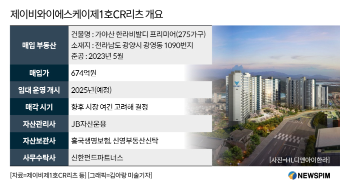 21일 업계에 따르면 JB자산운용이 설립한 CR리츠인 '제이비와이에스케이제1호'는 지난 15일 광양 '가야산 한라비발디 프리미어' 275가구를 674억원에 매입했다. 가구당 약 2억4509만원 수준이다. 매도자는 신한자산신탁이며 거래는 공매를 통해 이뤄졌다. 이 CR리츠는 지방 미분양 주택을 매입한 후 임대로 운영하다 시장 상황이 개선되면 매각해 수익을 확보하는 구조다. 현재 전체 332가구 중 제이비와이에스케이제1호가 매입한 275가구 전량이 미분양 물량이다.