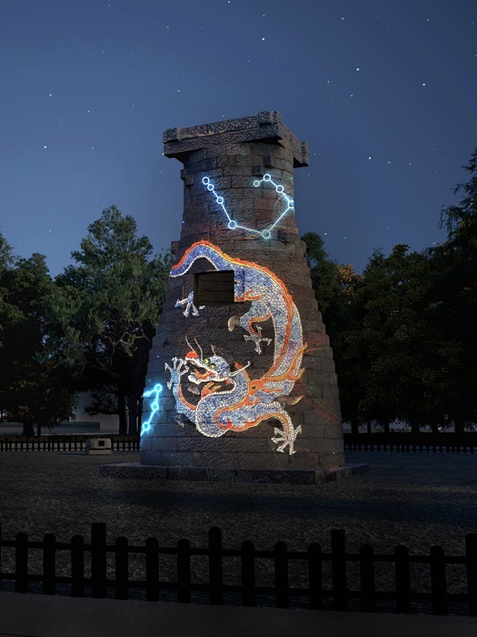 '미디어파사드'로 연출된 첨성대 외벽에 신라의 사신도 청룡이 투사된 장면.[사진=경주시]2025.10.20 nulcheon@newspim.com |