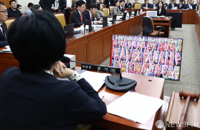[서울=뉴스핌] 최지환 기자 = 최민희 과학기술정보방송통신위원장이 20일 오후 국회 과학기술정보방송통신위원회에서 열린 국정감사에서 자녀 결혼식 관련 국민의힘 박정훈 의원의 발언을 듣고 있다. 2025.10.20 choipix16@newspim.com