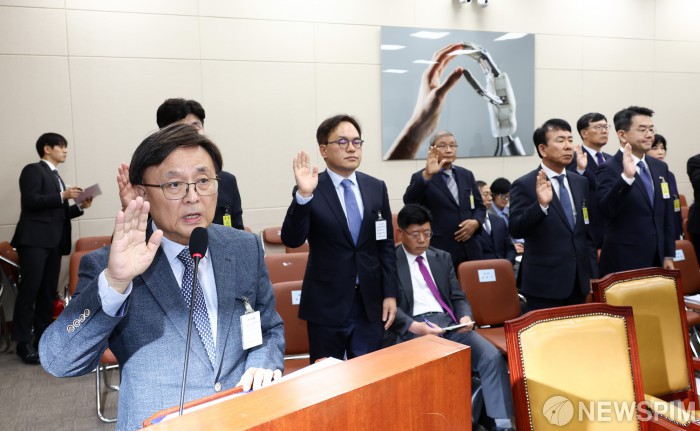 [서울=뉴스핌] 최지환 기자 = 김백 전 YTN 사장이 20일 오후 국회 과학기술정보방송통신위원회에서 열린 방송미디어통신위원회 관련(YTN,TBS,연합뉴스TV) 국정감사에서 증인선서를 하고 있다. 2025.10.20 choipix16@newspim.com