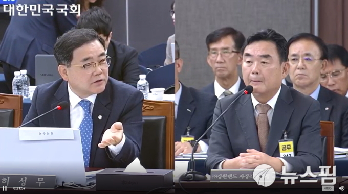 최철규 강원랜드 사장 직무대행(오른쪽)이 20일 국회 산업통상자원중소벤처기업위원회 국정감사에서 허성무 더불어민주당 의원 질의에 답하고 있다. [사진=국회 의사중계시스템 갈무리] 2025.10.20 dream@newspim.com |