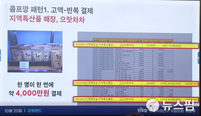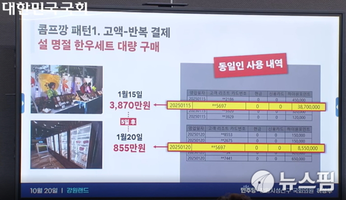 이어 "이 같은 비정상 거래는 물품 결제에만 그치지 않는다"며 "직접 참여해야 하는 150만 원짜리 스키 강습권이나 골프 라운드도, 같은 시간대에 한 사람이 10명분을 한꺼번에 결제한 사례가 있었다"고 지적했다.