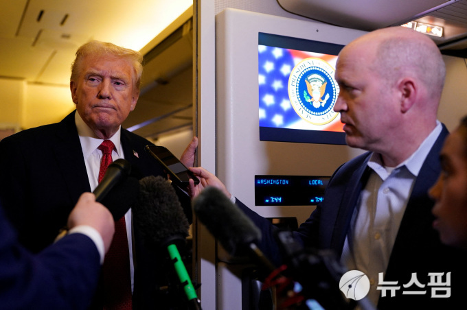 미국 도널드 트럼프 대통령이 2025년 10월 19일(현지시간) 플로리다에서 워싱턴으로 향하는 전용기 에어포스원 기내에서 취재진과 대화하고 있다.[사진=로이터 뉴스핌] |