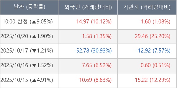 [서울=뉴스핌] 로보뉴스 = 21일 10시 15분 현재 HD현대인프라코어(042670)는 외국인과 기관이 각각 14.97 만 주, 1.60 만 주 순매수(잠정) 하면서 전일 대비 9.05% (현재가 16,390원) 상승하고 있다.