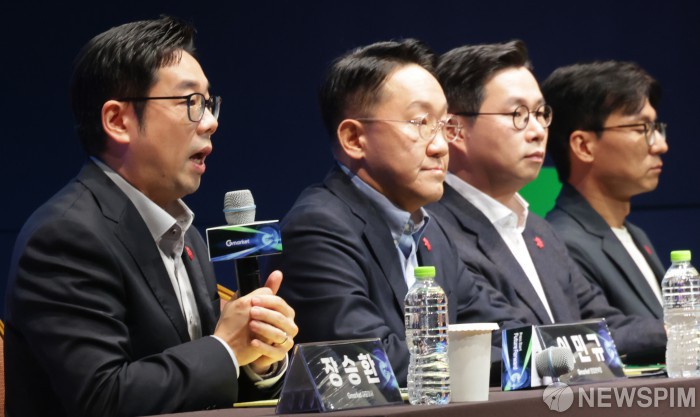 [서울=뉴스핌] 양윤모 기자 = 장승환 G마켓 대표이사와 임원진이 21일 서울 강남구 코엑스 오디토리움에서 열린 'G마켓 미디어데이' 행사장에서 G마켓의 향후 전략 방향 및 비전에 대해 취재진과의 Q&A를 하고 있다. 2025.10.21 yym58@newspim.com |