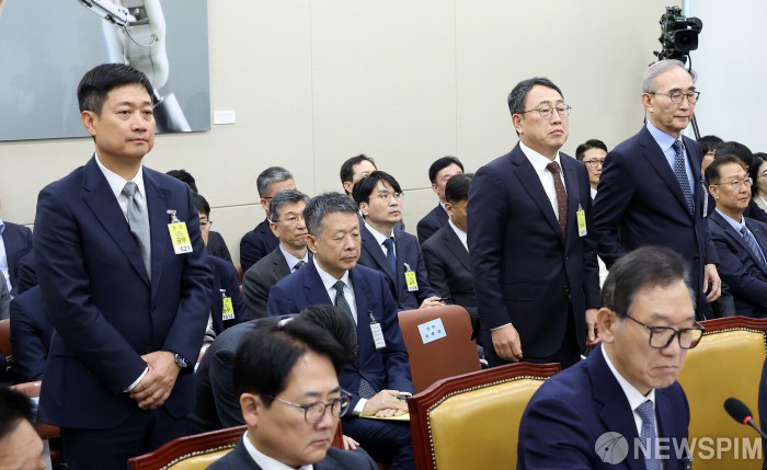 [서울=뉴스핌] 정일구 기자 = 홍범식 LG유플러스 대표(왼쪽부터), 유영상 SKT 대표, 김영섭 KT 대표가 21일 오후 서울 여의도 국회 과학기술정보방송통신위원에서 열린 정보통신산업진흥원 등에 대한 국정감사에서 의원 질의에 답하고 있다. 2025.10.21 mironj19@newspim.com