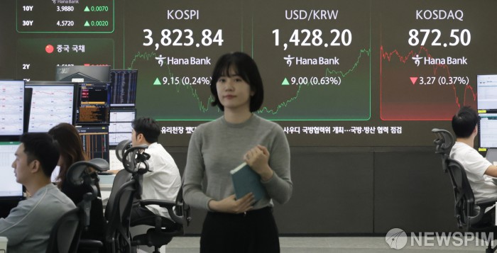 [서울=뉴스핌] 양윤모 기자 = 21일 오후 코스피가 전장 종가보다 9.15 포인트(0.24%) 상승하며 3823.84로, 코스닥은 3.27 포인트(0.37%) 하락한 872.50으로 장을 마감한 가운데, 서울 중구 하나은행 딜링룸에서 직원들이 업무를 보고 있다. 서울외환시장에서 달러/원 환율은 전장 대비 9.00원 상승한 1428.20원에 거래를 마감했다. 2025.10.21 yym58@newspim.com