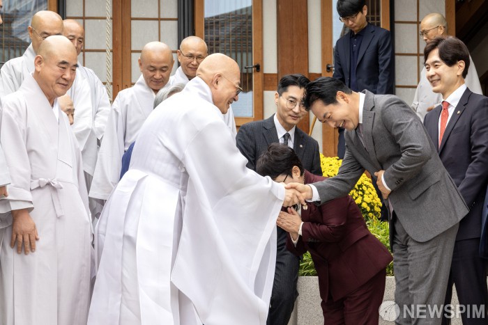 [서울=뉴스핌] 국회사진기자단 = 장동혁 국민의힘 대표(오른쪽)가 21일 오후 서울 강남구 봉은사를 찾아 대한불교조계종 총무원장 진우스님을 예방해 환담을 마친 후 인사하고 있다. 2025.10.21 photo@newspim.com