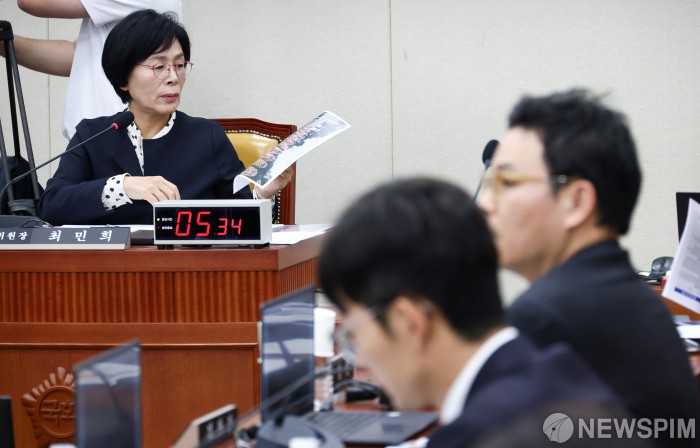 [서울=뉴스핌] 최지환 기자 = 최민희 과학기술정보방송통신위원장이 20일 오후 국회 과학기술정보방송통신위원회에서 열린 국정감사에서 자녀 결혼식 관련 국민의힘 박정훈 의원의 발언을 듣고 있다. 2025.10.20 choipix16@newspim.com |