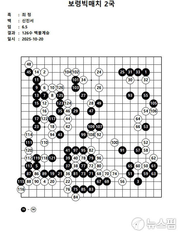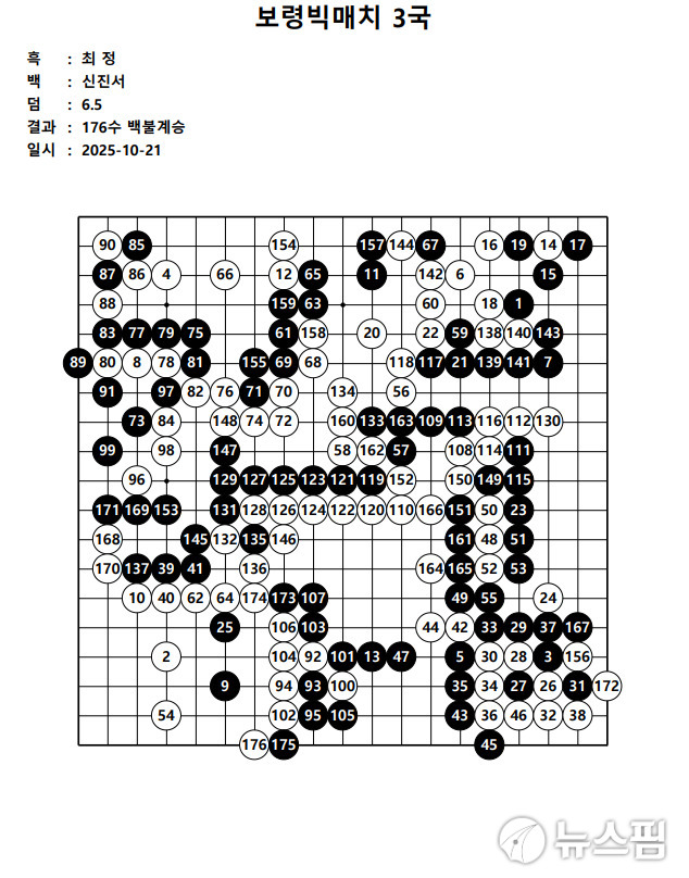 [서울=뉴스핌] 김용석 기자 = 신진서 9단이 '충남 방문의 해, 최정vs신진서 빅매치' 3국마저 낚아채며 보령에서의 3번기를 모두 승리로 이끌었다.