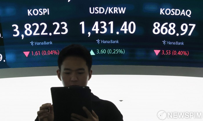 [서울=뉴스핌] 양윤모 기자 = 경주 APEC 정상회의를 앞두고 미국과의 관세 협상이 속도를 내는 가운데, 22일 오전 코스피가 전장 종가보다 1.61포인트(0.04%) 하락하며 3822.23으로, 코스닥은 3.53 포인트(0.40%) 하락한 868.97로 장을 시작한 가운데, 서울 중구 하나은행 딜링룸에서 직원들이 업무를 보고 있다. 서울외환시장에서 달러/원 환율은 전장 대비 3.60원 상승한 1431.40원에 거래를 시작했다. 2025.10.22 yym58@newspim.com