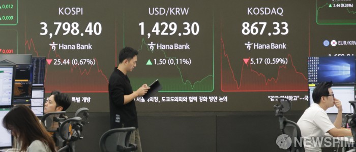[서울=뉴스핌] 양윤모 기자 = 경주 APEC 정상회의를 앞두고 미국과의 관세 협상이 속도를 내는 가운데, 22일 오전 코스피가 전장 종가보다 25.44포인트(0.67%) 하락하며 3798.40으로, 코스닥은 5.17포인트(0.59%) 하락한 867.33로 장을 시작한 가운데, 서울 중구 하나은행 딜링룸에서 직원들이 업무를 보고 있다. 서울외환시장에서 달러/원 환율은 전장 대비 1.50원 상승한 1429.30원에 거래를 시작했다. 2025.10.22 yym58@newspim.com