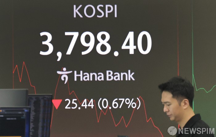 [서울=뉴스핌] 양윤모 기자 = 경주 APEC 정상회의를 앞두고 미국과의 관세 협상이 속도를 내는 가운데, 22일 오전 코스피가 전장 종가보다 25.44포인트(0.67%) 하락하며 3798.40으로, 코스닥은 5.17포인트(0.59%) 하락한 867.33로 장을 시작한 가운데, 서울 중구 하나은행 딜링룸에서 직원들이 업무를 보고 있다. 서울외환시장에서 달러/원 환율은 전장 대비 1.50원 상승한 1429.30원에 거래를 시작했다. 2025.10.22 yym58@newspim.com