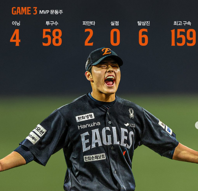 문동주는 지난 18일 대전에서 열린 PO 1차전에서 7회 구원 등판, 최고 시속 161.6km 강속구를 뿌리며 2이닝 1안타 무4사구 4삼진 무실점 홀드로 삼성의 추격 의지를 꺾었다. 한화는 9-8 역전승을 거뒀고, 문동주는 데일리 MVP에 선정됐다.