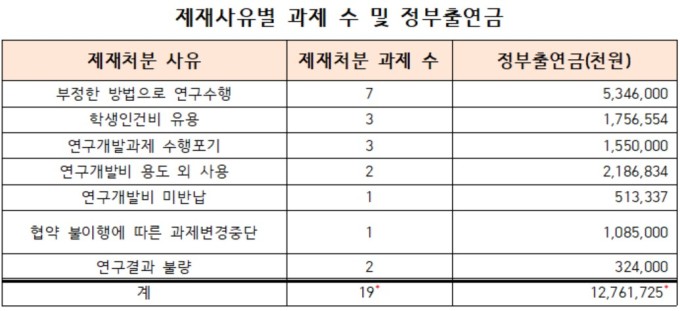 보산진의 제재처분별 사유를 보면 부정한 방법으로 연구를 수행한 과제가 7개로 가장 많았다. '학생 인건비 유용'과 '연구개발과제 수행포기' 과제가 3개로 뒤를 이었다.