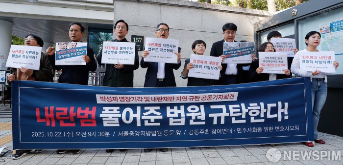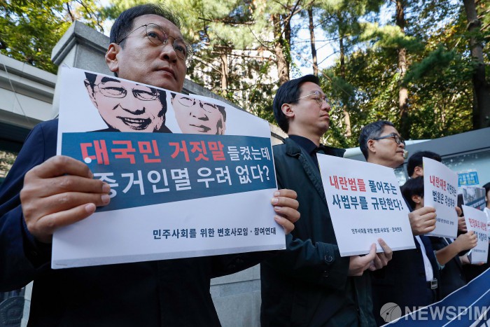 [서울=뉴스핌] 류기찬 기자 = 참여연대, 민주사회를 위한 변호사 모임이 22일 오전 서울 서초구 서울중앙지방법원 앞에서 '박성재 영장기각 및 내란재판 지연 규탄 공동기자회견'을 열고 있다. 2025.10.22 ryuchan0925@newspim.com |