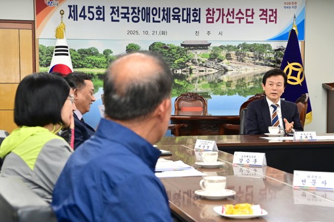 조규일 경남 진주시장이 21일 진주시청 기업인의 방에서 '제45회 전국장애인체육대회'에 출전하는 진주선수단을 격려하고 있다. [사진=진주시] 2025.10.22 |