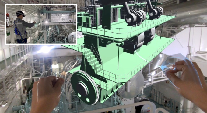 XR기술(갤럭시XR)을 활용해 선박 엔진을 검사하는 모습 [사진=삼성중공업] |