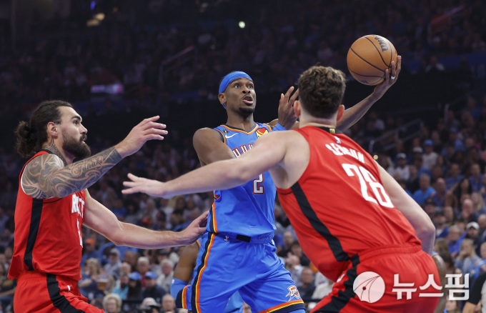 [오클라호마시티 로이터=뉴스핌] 장환수 스포츠전문기자= 오클라호마시티 가드 샤이 길저스 알렉산더가 22일 홈에서 열린 휴스턴과 공식 개막전에서 상대 수비를 헤치고 슛을 시도하고 있다. 2025.10.22 zangpabo@newspim.com |