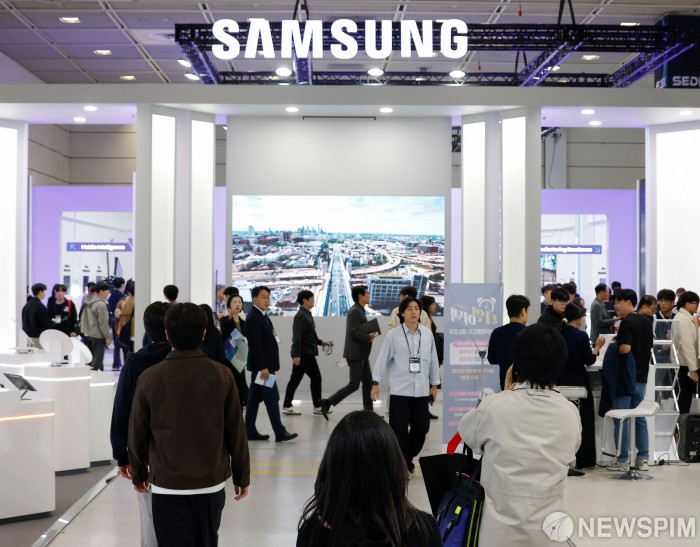 [서울=뉴스핌] 류기찬 기자 = 제27회 반도체대전(SEDEX 2025)이 개막한 22일 오후 서울 강남구 코엑스에서 관람객들이 삼성전자의 부스를 살펴보고 있다. 2025.10.22 ryuchan0925@newspim.com
