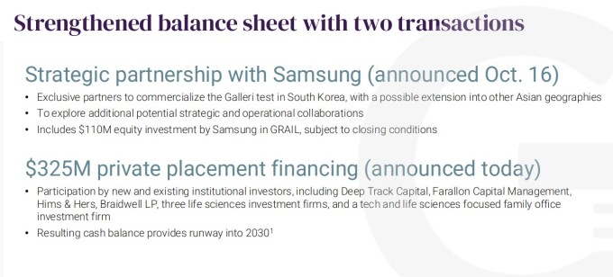 10월 16일 발표된 삼성과의 전략적 협력은 그레일의 글로벌 확장 전략에서 중요한 전환점이다. 삼성물산과 삼성전자는 주당 70.05달러로 총 1억 1000만 달러를 공동 투자하며, 갤러리 다중 암 조기 진단 검사의 주요 아시아 시장 진출을 지원한다.