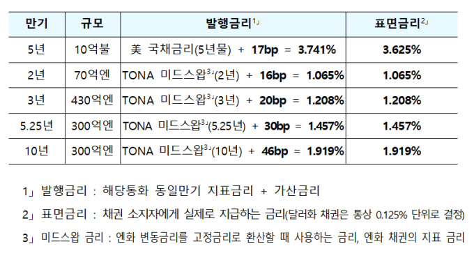 기재부에 따르면, 이번 외평채는 5년 만기 달러화 표시 채권 10억달러와 2년·3년·5.25년·10년 만기 엔화 표시 채권 1100억엔(7억달러 상당)으로 나눠 발행됐다.