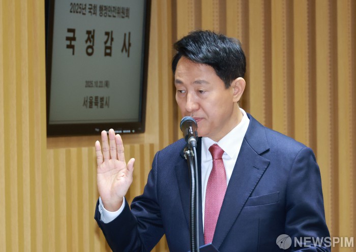 [서울=뉴스핌] 김학선 기자 = 오세훈 서울시장이 23일 서울시청에서 열린 국회 행정안전위원회 국정감사에서 증인선서를 하고 있다. 2025.10.23 yooksa@newspim.com