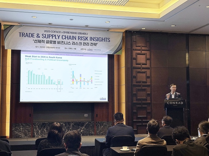 [서울=뉴스핌] 이윤애 기자 = 23일 서울 여의도 콘래드 호텔에서 열린 KODATA와 Coface 공동 세미나에서 Coface의 동북아시아 담당 이코노미스트 준유 탄(Junyu Tan)이 발표를 하고 있다. [사진= KODATA] 2025.10.23 yunyun@newspim.com |