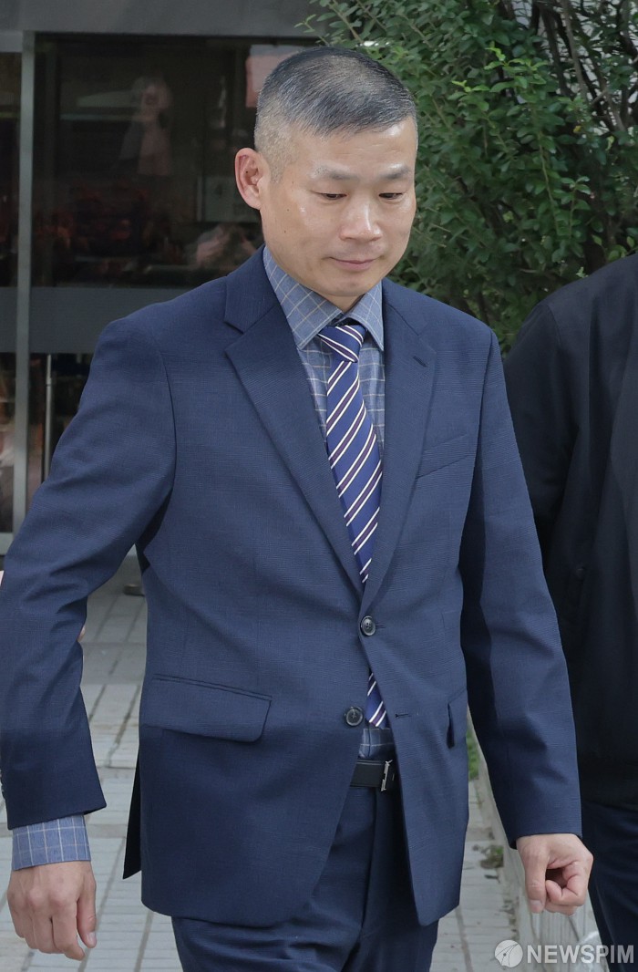 [서울=뉴스핌] 양윤모 기자 = 채상병 순직 및 수사 외압·은폐 의혹의 피의자인 김동혁 전 국방부 검찰단장이 23일 오후 서울 서초구 서울중앙지법에 열린 구속 전 피의자 심문(영장실질심사)을 마치고 대기장소로 이동하고 있다. 2025.10.23 yym58@newspim.com