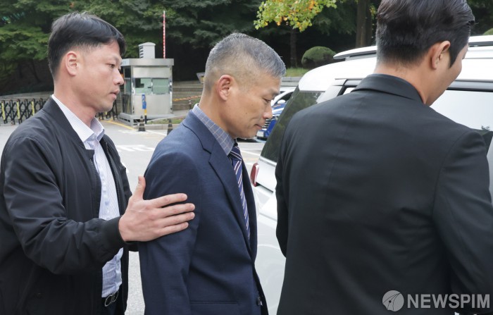 [서울=뉴스핌] 양윤모 기자 = 채상병 순직 및 수사 외압·은폐 의혹의 피의자인 김동혁 전 국방부 검찰단장이 23일 오후 서울 서초구 서울중앙지법에 열린 구속 전 피의자 심문(영장실질심사)을 마치고 대기장소로 이동하고 있다. 2025.10.23 yym58@newspim.com