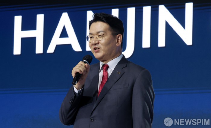 [서울=뉴스핌] 최지환 기자 = 조원태 한진그룹 회장이 23일 오후 서울 용산구 그랜드하얏트 서울에서 열린 한진그룹 80주년 기념식에서 발언하고 있다. 2025.10.23 choipix16@newspim.com