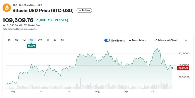 비트코인 가격 차트, 자료=야후 파이낸스, 2025.10.23 koinwon@newspim.com |