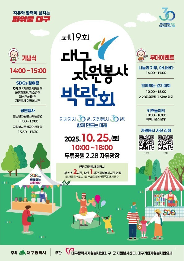 [대구=뉴스핌] 김용락 기자=대구광역시는 시민들의 자원봉사 참여문화 확산과 자원봉사자들의 자긍심 고취를 위해 오는 25일 두류공원 2·28자유광장에서 '제19회 대구자원봉사박람회'를 개최한다. 이번 박람회는 '지방자치 30년, 자원봉사 30년: 함께 만드는 미래'라는 슬로건 아래, 범시민적 자원봉사 참여 분위기 확산을 목표로 시민 누구나 자원봉사를 쉽게 체험하고 이해할 수 있도록 다양한 프로그램으로 꾸며진다.