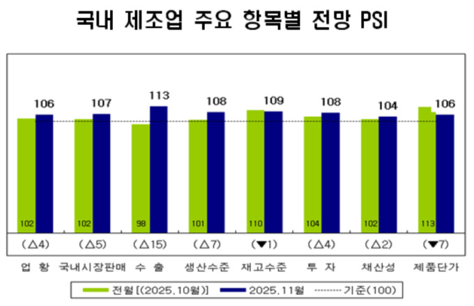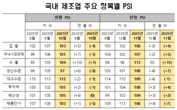 | 국내 제조업 주요 항목별 전망 PSI [자료=산업연구원] 2025.10.24 rang@newspim.com |
