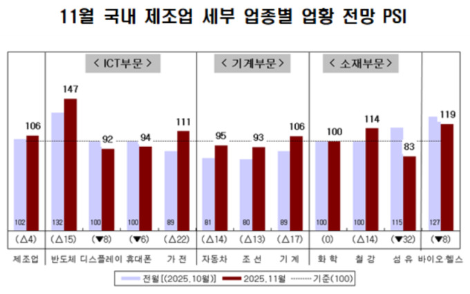 | 11월 국내 제조업 세부 업종별 업황 전망 PSI [자료=산업연구원] 2025.10.24 rang@newspim.com |