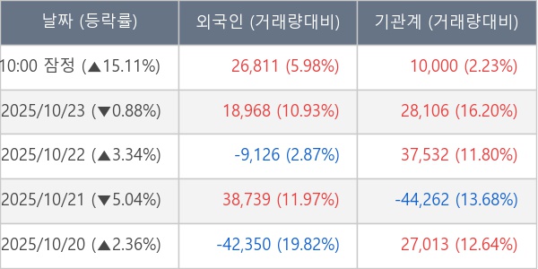 [서울=뉴스핌] 로보뉴스 = 24일 10시 15분 현재 에프에스티(036810)는 외국인과 기관이 각각 2.68 만 주, 1.00 만 주 순매수(잠정) 하면서 전일 대비 15.11% (현재가 38,850원) 상승하고 있다.