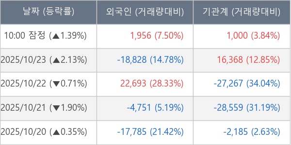 [서울=뉴스핌] 로보뉴스 = 24일 10시 15분 현재 노머스(473980)는 외국인과 기관이 각각 0.20 만 주, 0.10 만 주 순매수(잠정) 하면서 전일 대비 1.39% (현재가 29,150원) 상승하고 있다.